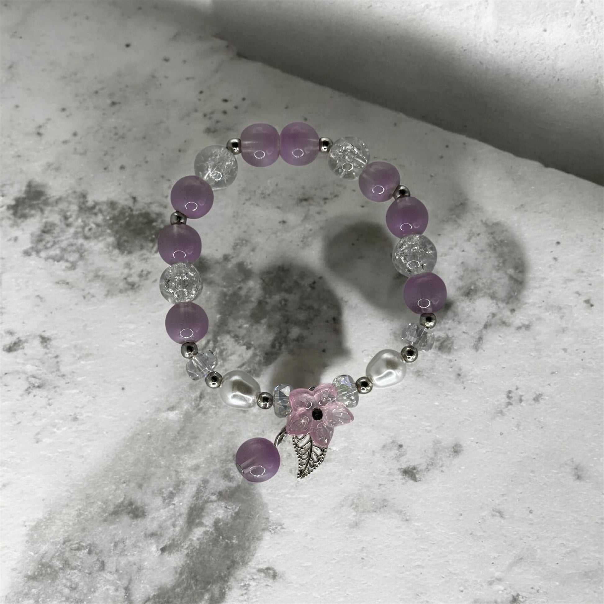 Embrace your inner free spirit with "Dancing In The Flower Feilds," a beautiful handcrafted bracelet made with pink-purple beads and a delicate pink flower charm. The silver accents and clear beads add a touch of whimsy to this unique piece, perfect for adding a pop of color to any outfit.