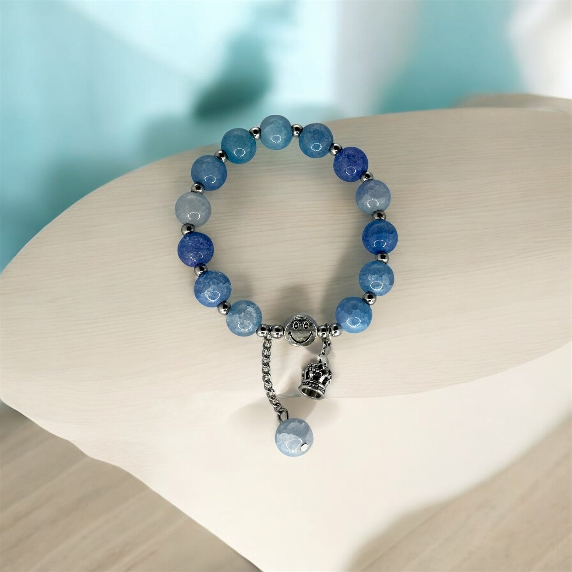 Embrace the happily dazed life with this quirky queen bracelet. The variance of blues and hanging glass bead charm add a touch of whimsy, while the smiley face charm brings constant positivity. Get ready to turn heads and spread joy with this unique accessory.