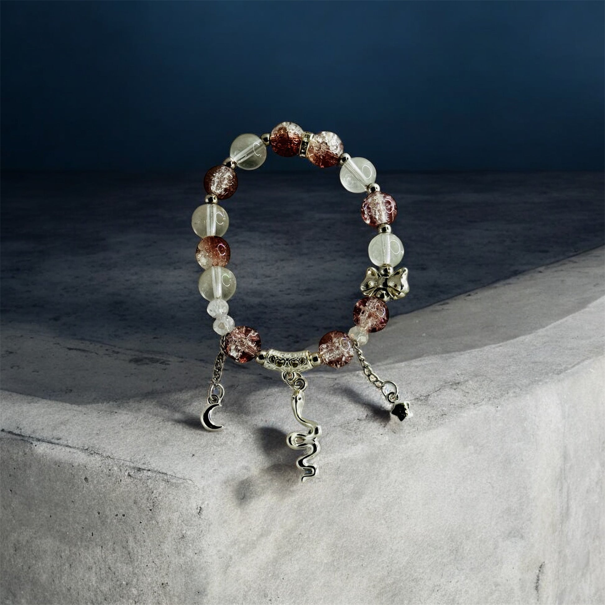Unleash your wild side with our Queen of Slithers bracelet! Hand crafted with a pinkish brownish color, it features three silver charms - a moon, star, and snake - along with a bow charm bead. This unique bracelet will add a touch of playful elegance to any outfit.
